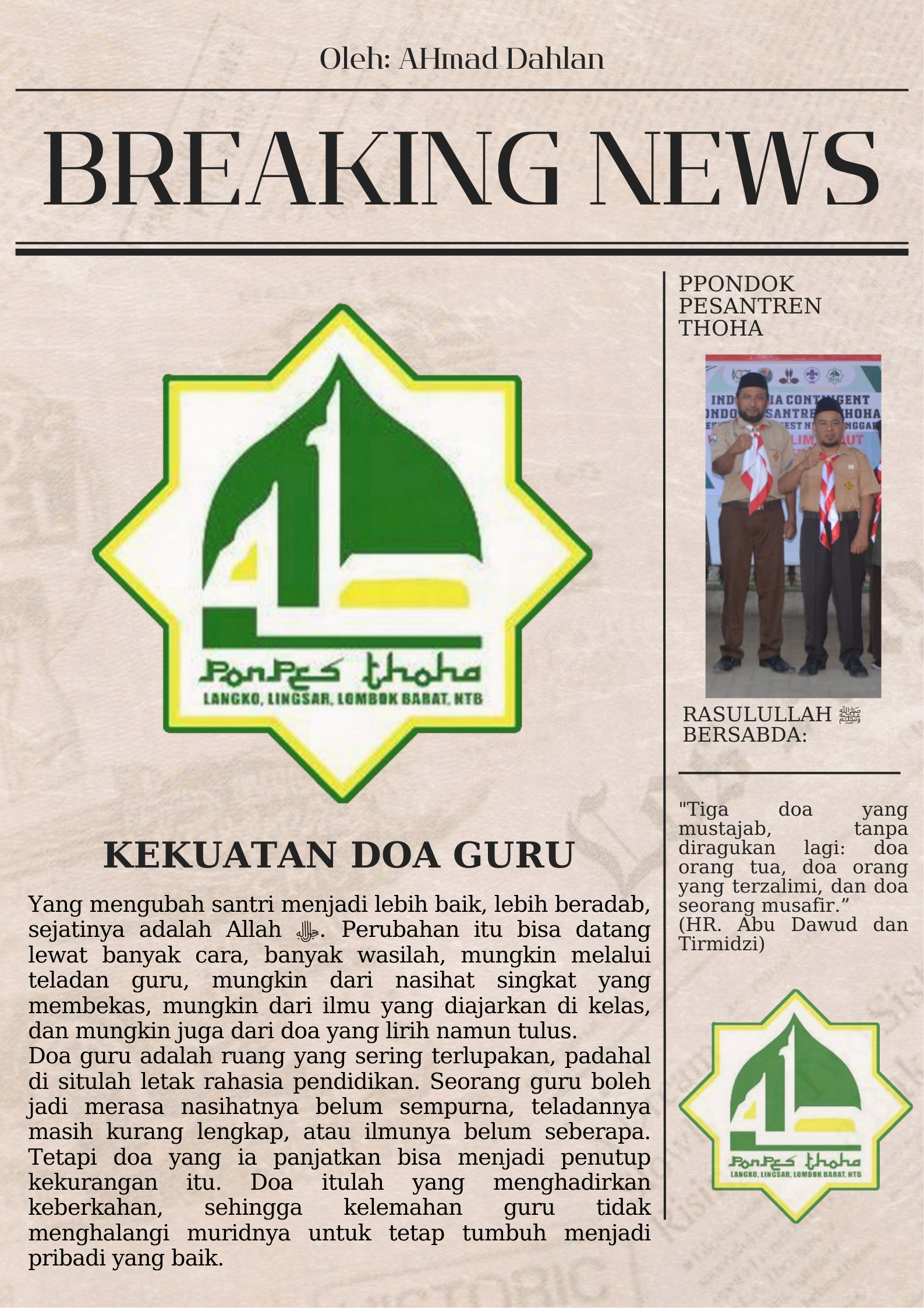 Kekuatan Doa Guru Oleh: Ahmad Dahlan Yang mengubah santri menjadi lebih baik, lebih beradab, sejatinya adalah Allah ﷻ. Perubahan itu bisa datang lewat banyak cara, banyak wasilah, mungkin melalui teladan guru, mungkin dari nasihat singkat yang membekas, mungkin dari ilmu yang diajarkan di kelas, dan mungkin juga dari doa yang lirih namun tulus. Doa guru … Read more